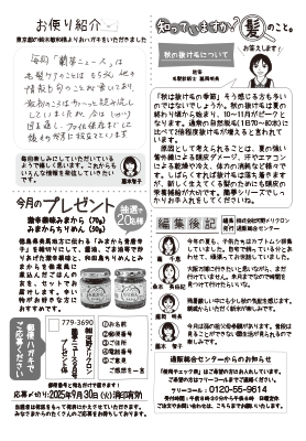 9月に入り、日中はまだ厳しい暑さが続いていますが、お元気にお過ごしでしょうか。朝晩の暑さが和らぎ、日が落ちる時間が早くなると秋はすぐそこまで来ていると感じますね。